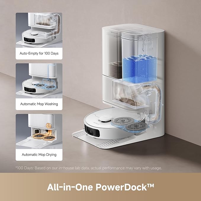 Robot prav tako prepozna preproge in samodejno dvigne mop, da prepreči mokro umazanijo na tkaninah. Baterija z veliko kapaciteto omogoča dolgo avtonomijo čiščenja (več ur na eno polnjenje), z možnostjo, da robot ob nizki bateriji sam pristane na postaji in se nato vrne ter nadaljuje čiščenje tam, kjer je zaključil.